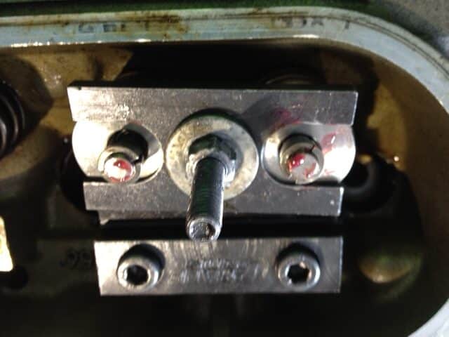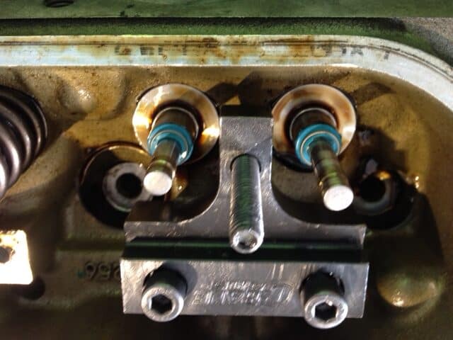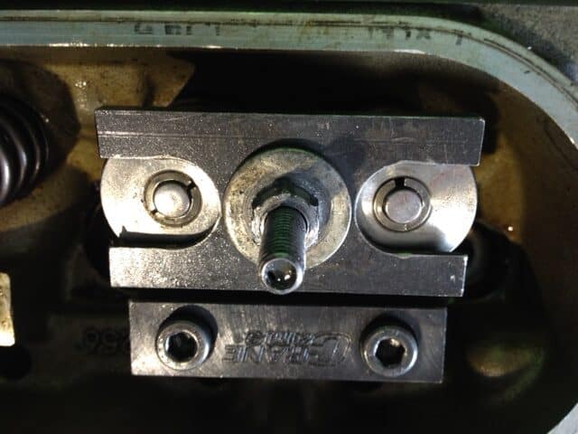 Crane Valve Spring Tool installed onto springs.Tighten the 1/2″ nut to compress the springs and remove the locks.