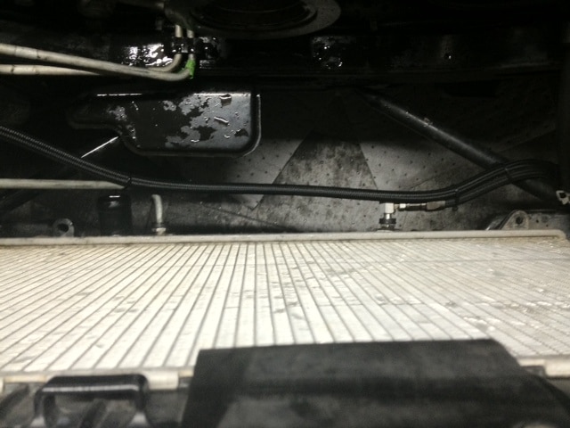 - Disconnect a/c lines from the passenger side of the condensor. One is at the top, one is on the side, both are 13mm. Be careful to a) not lose the o-rings and b) not make a mess with the a/c oil that will leak out. Swivel lines out of the way.