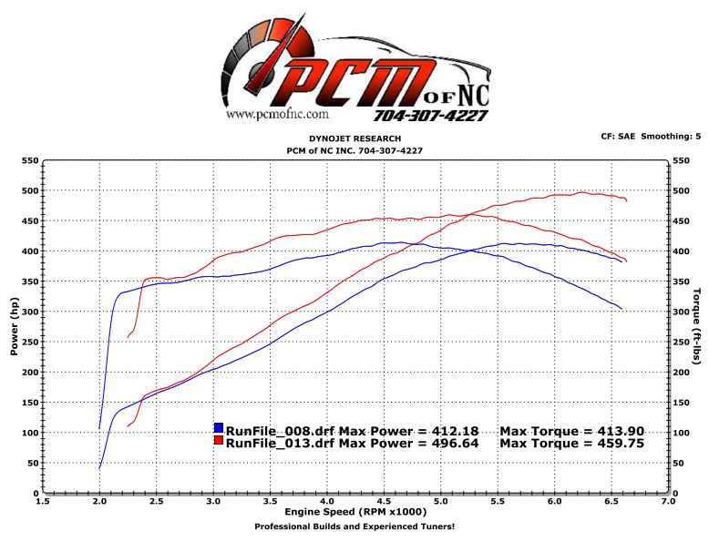 This car originally had Kooks longtube headers with cats installed in 2010, along with a Roto Fab intake, baselining at 412rwhp and 413 ft/lbs torque.
