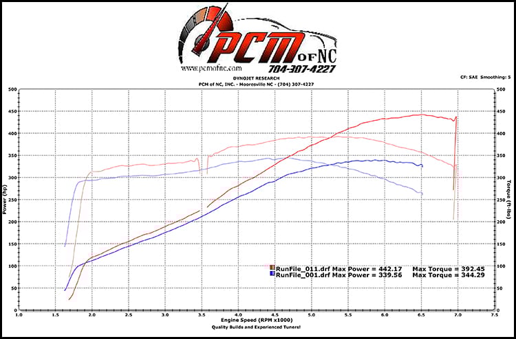 This car started at 339rwhp & 344 ft/lbs tq. After our modifications, it went home with 442 rwhp & 392 ft/lbs tq! The dyno graph showed gains all across the power band, and as always, the driveability ended up great as well.