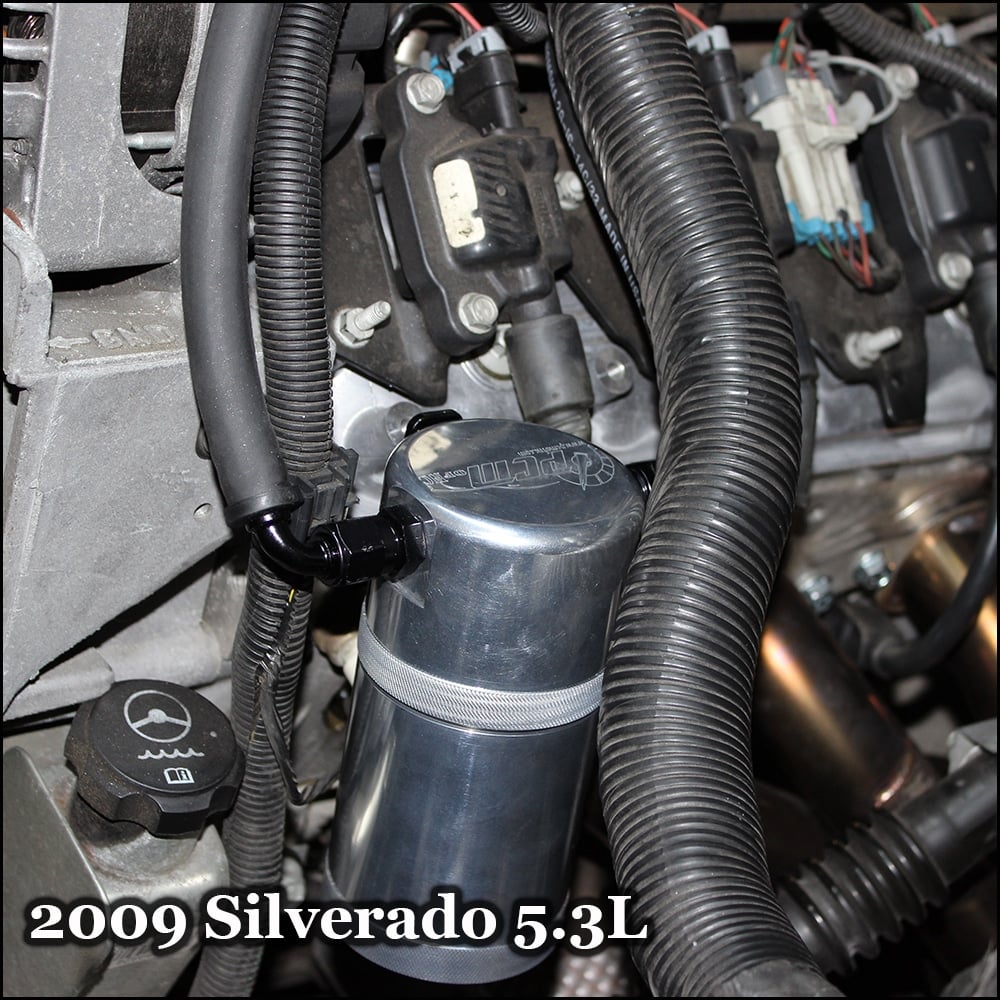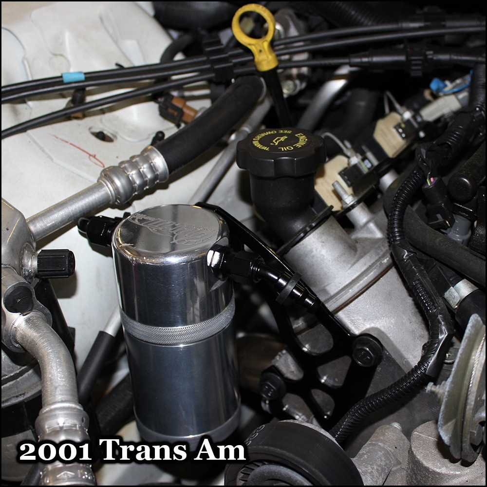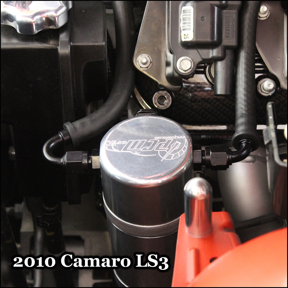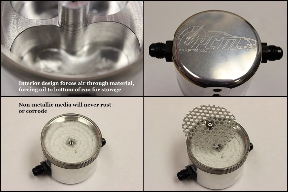 PCM of NC is now offering our own catch can kit. CNC Machined from 6061 aluminum, these high quality cans install in very little time, and are easy to empty (simply unscrew). Comes in polished finish. Our many bracket options take the guesswork out of the install, attaching cleanly to the cylinder head in six possible locations, plus three more DIY options. All hardware and hoses are provided, along with powder coated CNC-cut brackets and high quality AN fittings. No exposed pipe threads or brass fittings are used in our kit! No unsightly hose clamps! Our cans feature non-metallic filter media – no rusting or potential metal debris going through your engine. If you do not see your vehicle listed in Fitment Information, one of our Generic brackets will most likely allow mounting in one spot or another (see photos to get ideas). See how easy it is to install – download instructions HERE!