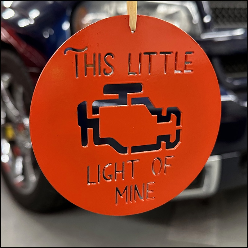 This charming ornament is .090″ thick and measures approximately 4.5″ in diameter. Powdercoated in Check Engine Orange, it’s sure to make you smile, or make a great gift to put on the tree this year. Check out our other ornaments too – NNBS Silverado OrnamentBuilt Not Bought Ornament – TBSS Christmas Ornament.